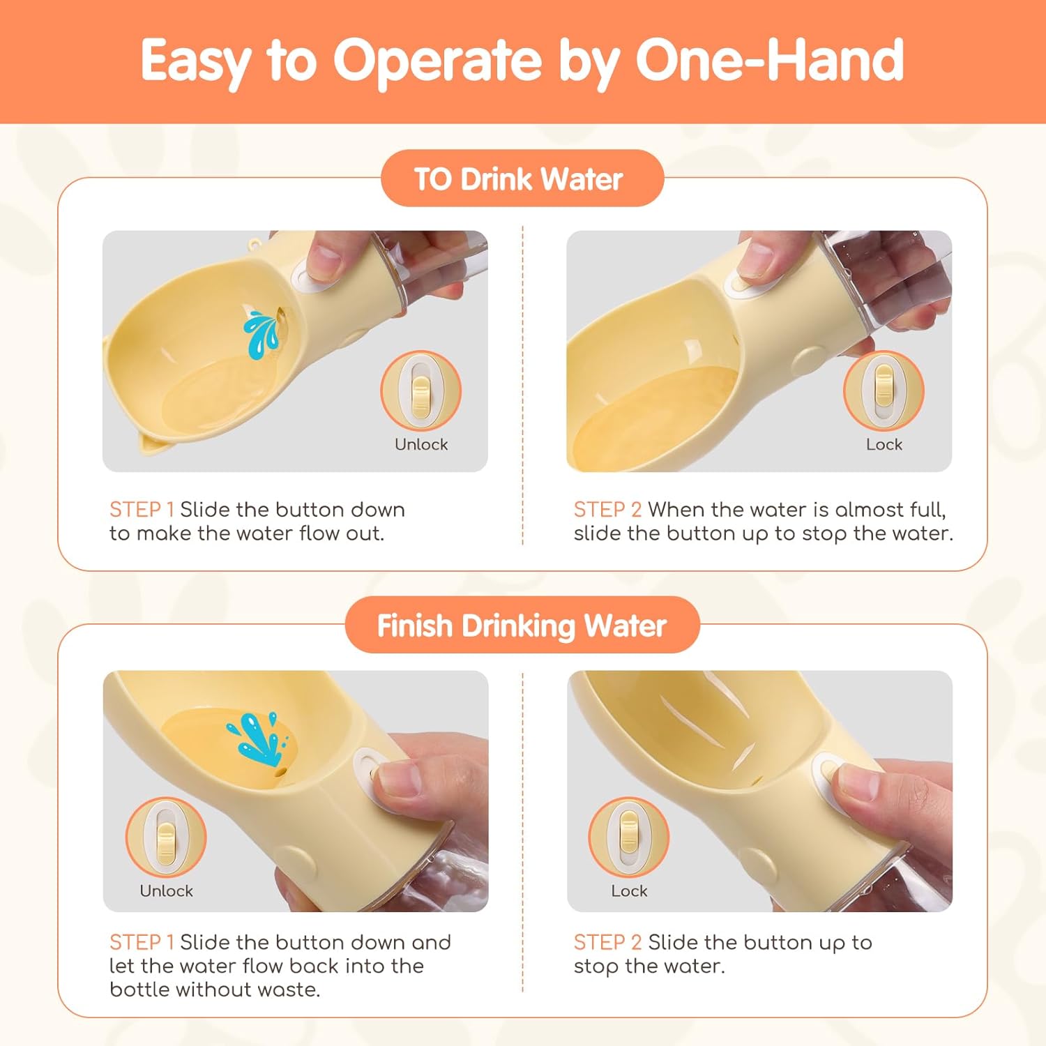 The built-in drinking tray allows your pet to drink comfortably, while the bottom compartment stores dry food or treats for quick feeding. A control button releases water into the bowl when needed and closes it after use. The leak-resistant seal helps keep bags and hands dry during travel.
